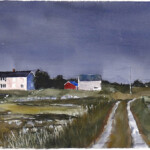 “Touch of Light” explores the dialogue between darkness and light — a recurring theme in his Norwegian landscapes. The transparent and unpredictable nature of watercolour reflects the ever-changing northern weather and shifting light.